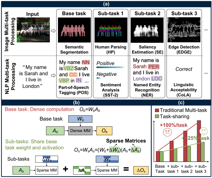 TaskFusion is an efficient software-hardware co-design for multi-task natural language processing (NLP), utilizing delta sparsity in weights and activations to reduce computation costs, achieving substantial performance and energy efficiency gains.